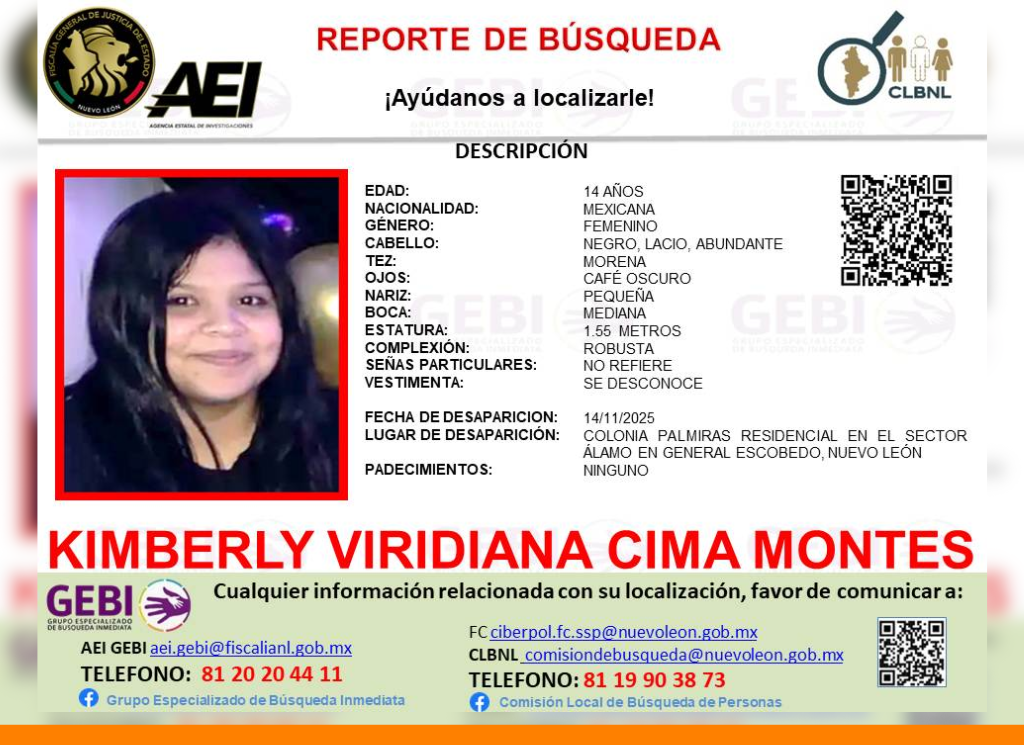 Escobedo, Nuevo León.– Una menor identificada como Kimberly Viridiana Cima Montes desapareció luego de salir de su casa en el municipio de Escobedo para encontrarse con una persona que presuntamente conoció a través del videojuego ROBLOX.