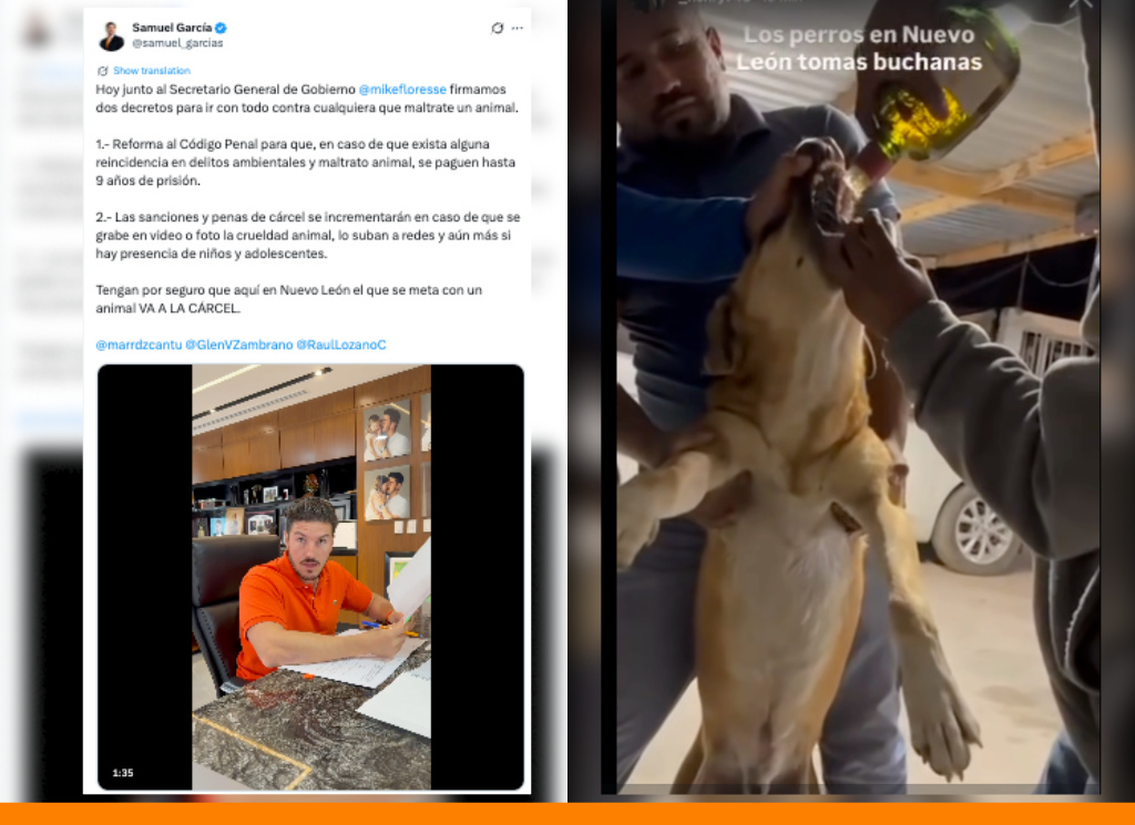 2.- Las sanciones y penas de cárcel se incrementarán en caso de que se grabe en video o foto la crueldad animal, se suba a redes sociales y aún más si hay presencia de niños o adolescentes. “Tengan por seguro que aquí en Nuevo León, el que se meta con un animal VA A LA CÁRCEL”, declaró.