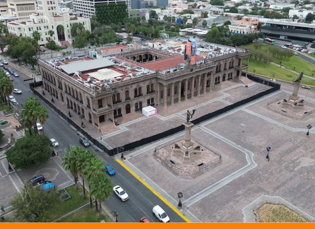 Monterrey, Nuevo León.— El Palacio de Gobierno del Estado amaneció completamente cercado este 25 de noviembre, previo a la marcha con motivo del Día Internacional de la Eliminación de la Violencia contra las Mujeres y las Niñas.