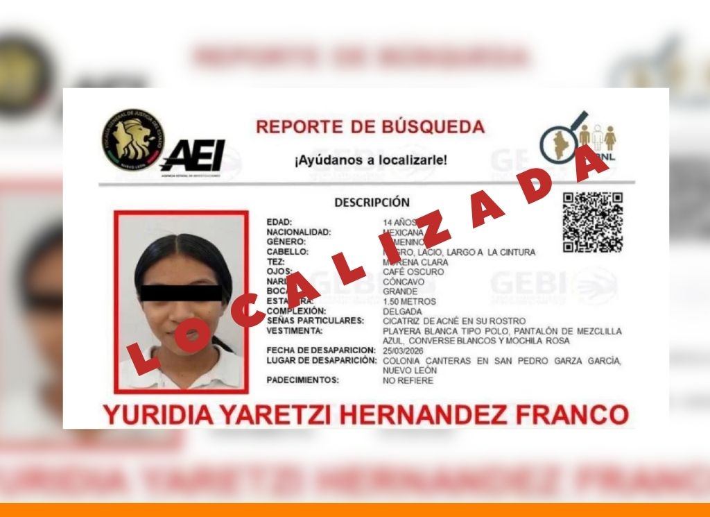 La adolescente, identificada como Yuridia, fue ubicada en el municipio de San Pedro Tlaquepaque, tras la activación de protocolos de búsqueda por parte de las autoridades, luego de recibir el oficio correspondiente relacionado con su desaparición.