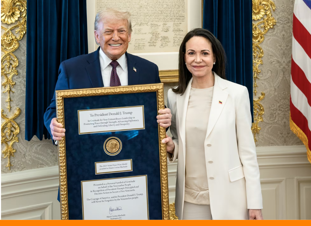 Washington, EE. UU. – La opositora venezolana María Corina Machado, galardonada con el Premio Nobel de la Paz 2025, entregó simbólicamente su medalla al presidente estadounidense Donald Trump durante una visita a la Casa Blanca, en un gesto que ha generado controversia internacional.