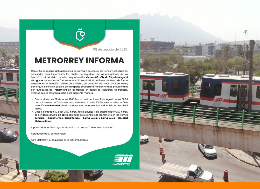 Monterrey, NL.– El Sistema de Transporte Colectivo Metrorrey informó que suspenderá la operación de la estación Talleres de la Línea 1, así como el servicio total de las Líneas 2 y 3, a partir de las 21:00 horas de este viernes 8 de agosto. El servicio se reanudará el lunes 11 de agosto.