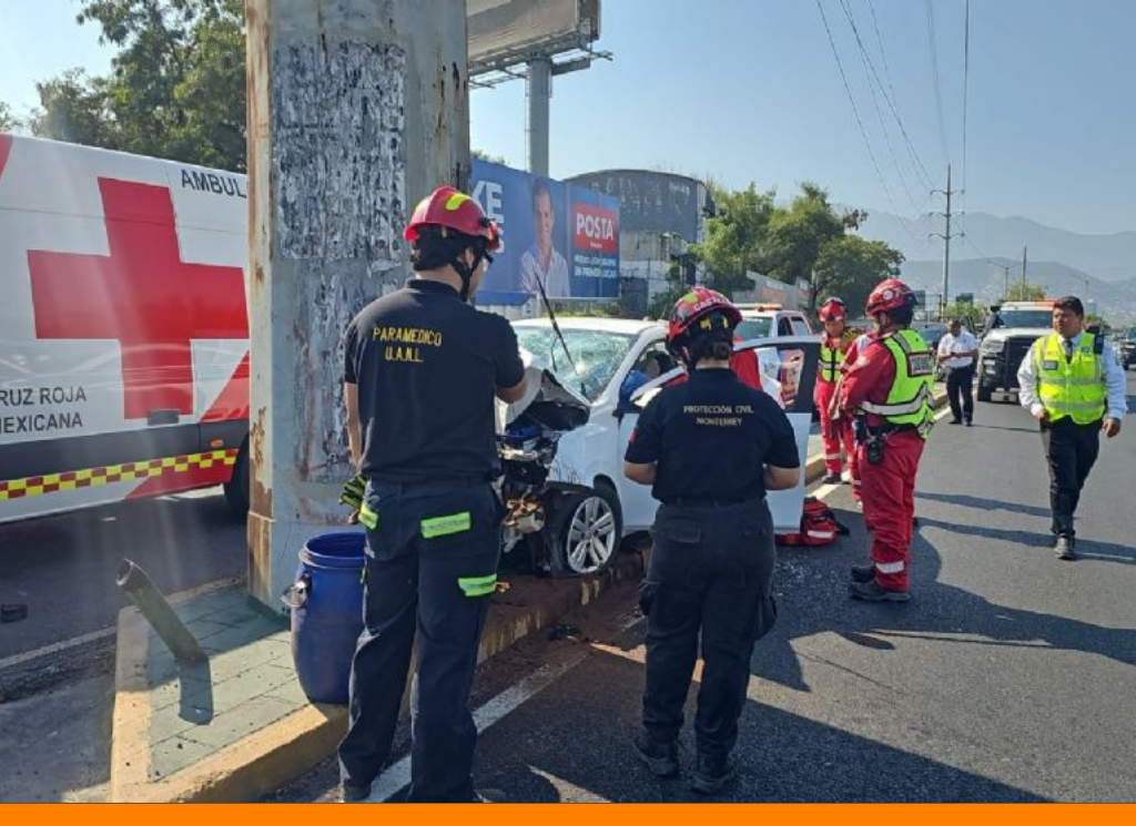 De acuerdo con información de Protección Civil de Monterrey, el incidente fue reportado a través de la línea de emergencias. Al arribar al lugar, los rescatistas confirmaron que un automóvil Chevrolet Aveo, color blanco, se había impactado contra una torre de iluminación ubicada en el camellón central que divide los carriles ordinarios y los express de la vialidad.