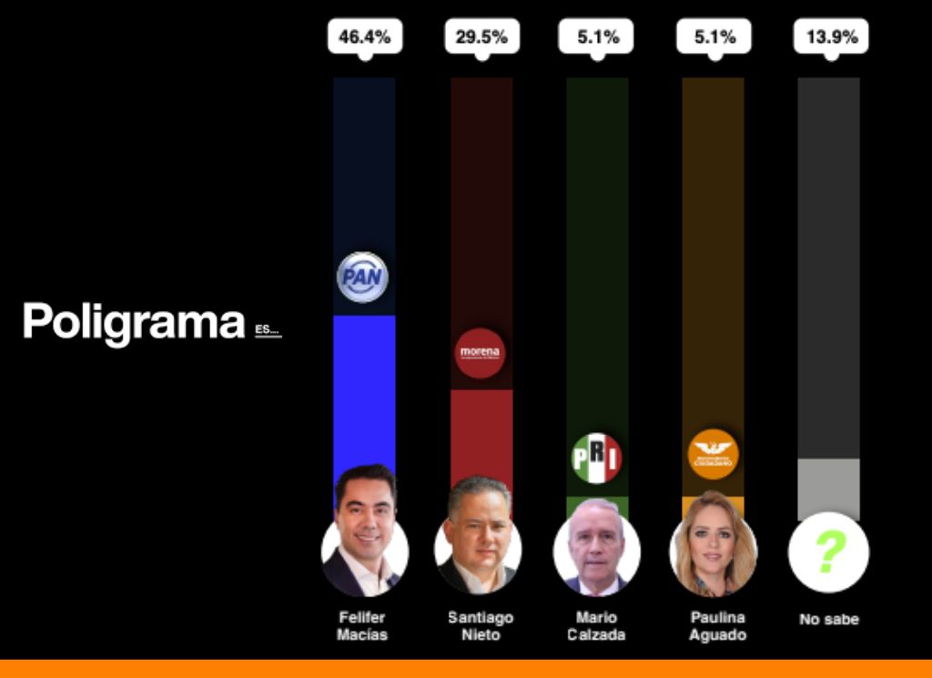 De acuerdo con el estudio, levantado el 18 de marzo de 2026 con mil entrevistas a personas mayores de edad, Macías lidera las preferencias con el 46.4%, seguido por Santiago Nieto, identificado con Morena, quien registra un 29.5% de apoyo.