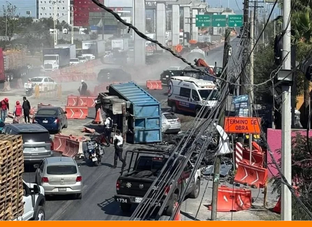 De acuerdo con información de Protección Civil de Nuevo León, el percance se originó cuando un camión que transportaba piezas metálicas impactó a un automóvil particular, provocando que la unidad de carga terminara volcada.