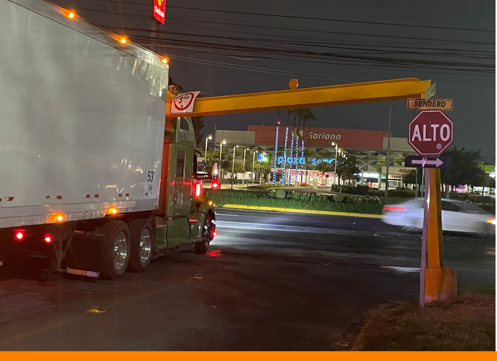 Minutos después giró hacia la calle Lázaro Cárdenas con la intención de conectarse a la avenida Sendero. En ese cruce existe una estructura metálica de tres metros con 80 centímetros de altura, colocada para impedir el paso de vehículos pesados hacia el interior del sector.