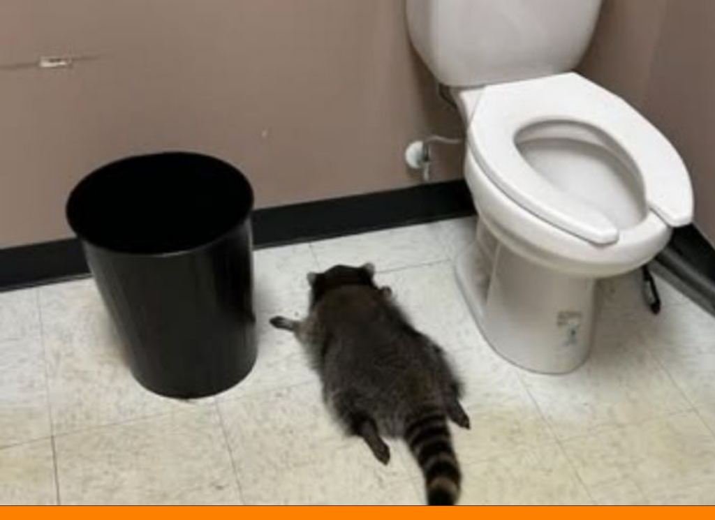 Una noche de excesos: mapache entra a tienda, bebe alcohol y es hallado inconsciente en el baño