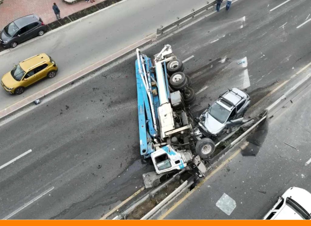 Monterrey, Nuevo León.- Un camión bombeador de concreto volcó al descender de un puente en la zona de El Uro, al sur de Monterrey; la vialidad quedó interrumpida en los carriles que circulan de norte a sur.