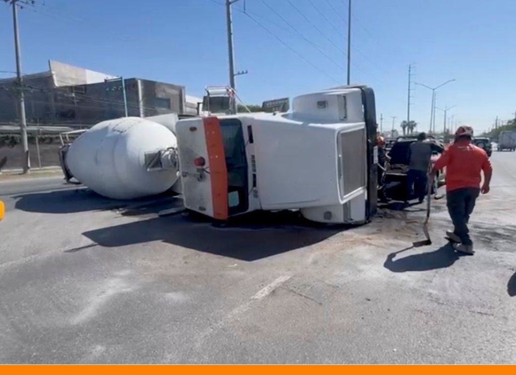 Guadalupe, Nuevo León.— La volcadura de un camión tipo revolvedora que transportaba concreto se registró la mañana de este miércoles sobre la carretera Reynosa, a la altura de la calle División del Norte, frente a la colonia Francisco Villa, en el municipio de Guadalupe.